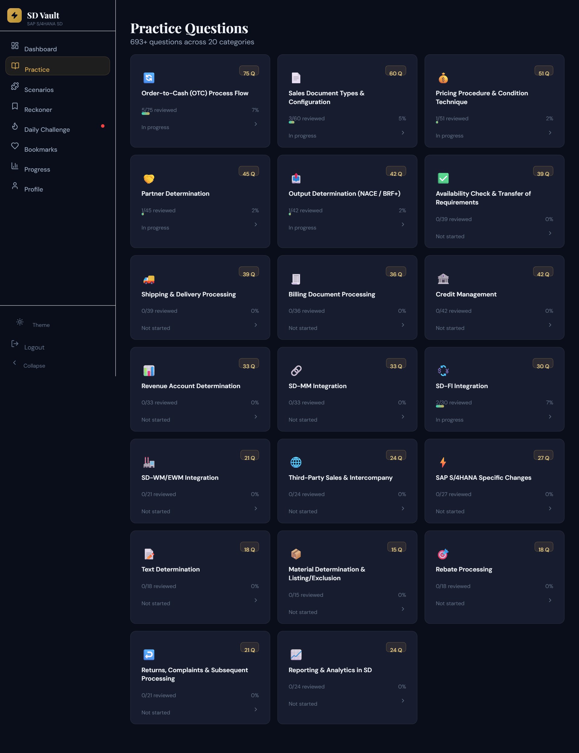Work through categories, tackle daily challenges, and explore real-world scenarios.